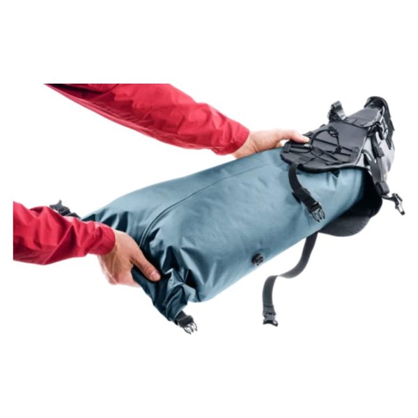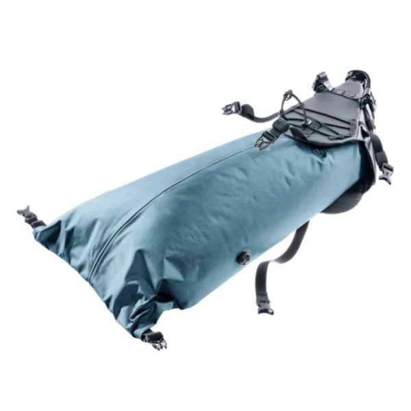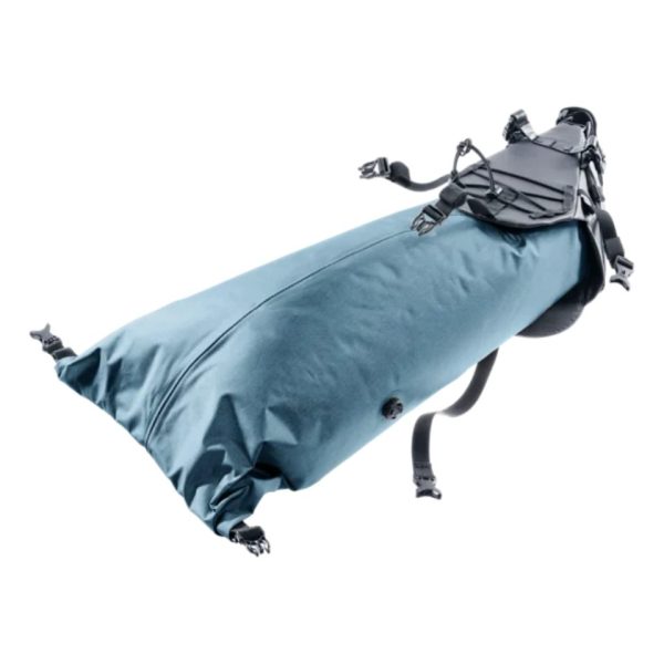 - roll-top dry bag attaches to the saddle harness at the sides and middle using buckle straps