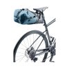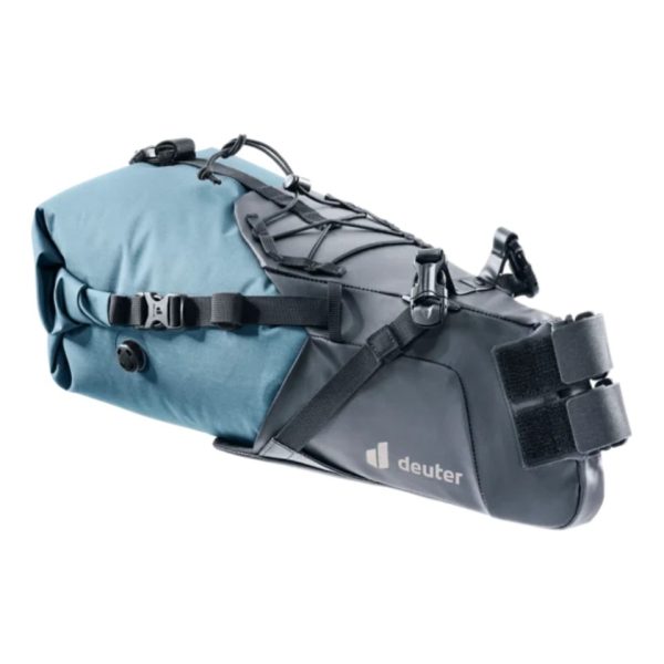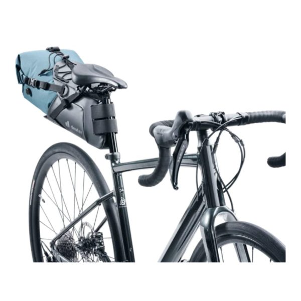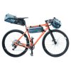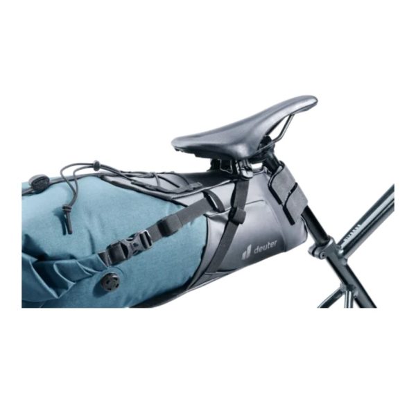 The two-piece construction of this saddle pack for globetrotting bikepackers is made up of a lightweight, waterproof dry bag with a buckle closure roll-top and air-release valve, and a harness with a bungee cord and gear loops on the top, and a reinforced base which makes loading and unloading quick and easy during short rest breaks, because the dry bag can be detached while the harness stays on the bike. The two buckle straps and two hook & loop straps adjust to a variety of frame sizes and tube diameters, including carbon bikes.