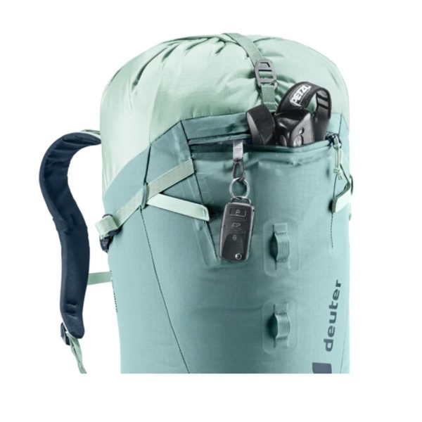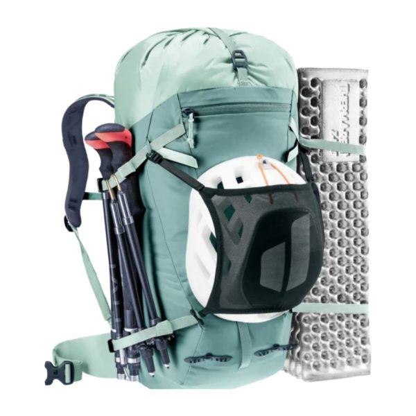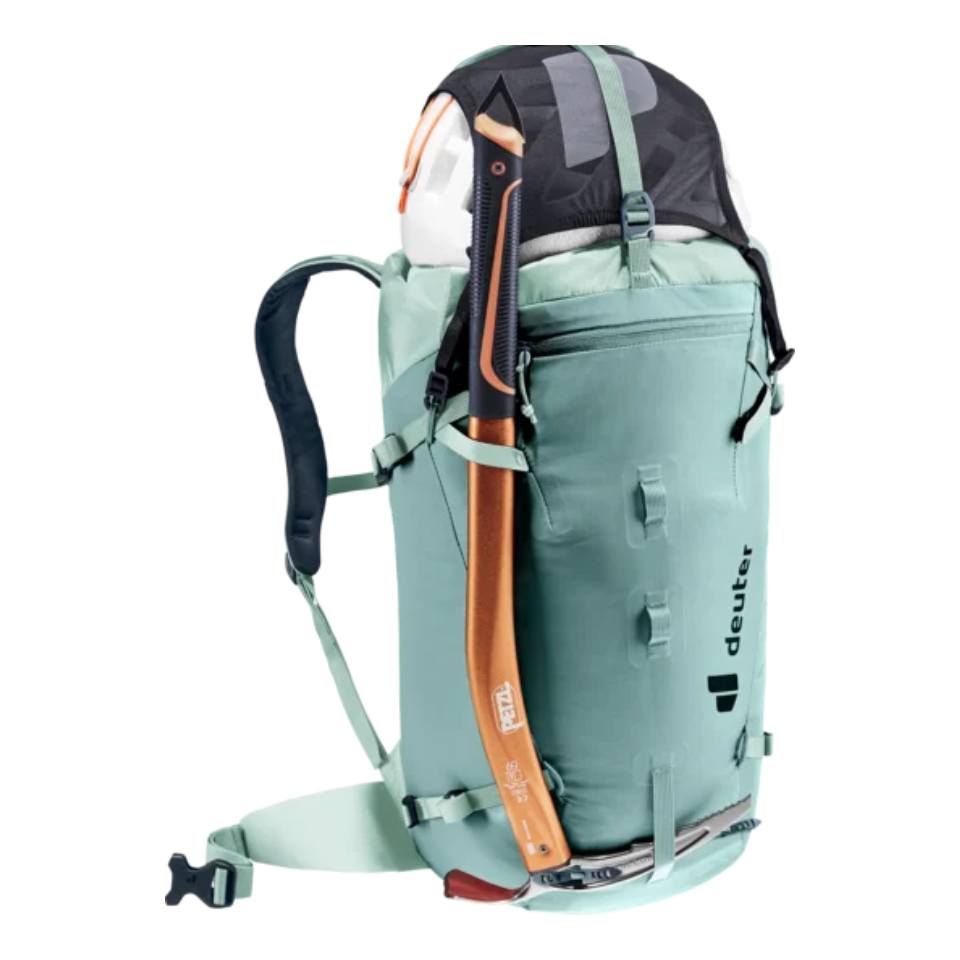 Climate neutral, PFAS free and light weight are the hallmarks of the Guide SL backpack with no-fuss handling. Hard-wearing materials, further improved ice axe and helmet attachment systems, a stowable rope strap, and hip fins make this backpack a versatile companion for demanding projects – and compatible with a climbing harness. The new lid design provides fast access to the main compartment. And there is a detachable mesh helmet holder integrated into the lid, which can also be repositioned onto the front of the pack.